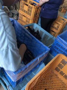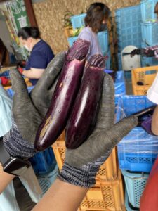 農作業は夏野菜の作業を実施しています。今回はナスの検品とコンテナ詰めの作業風景です。