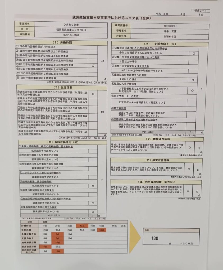 就労継続支援A型事業所におけるスコア表を掲載します。